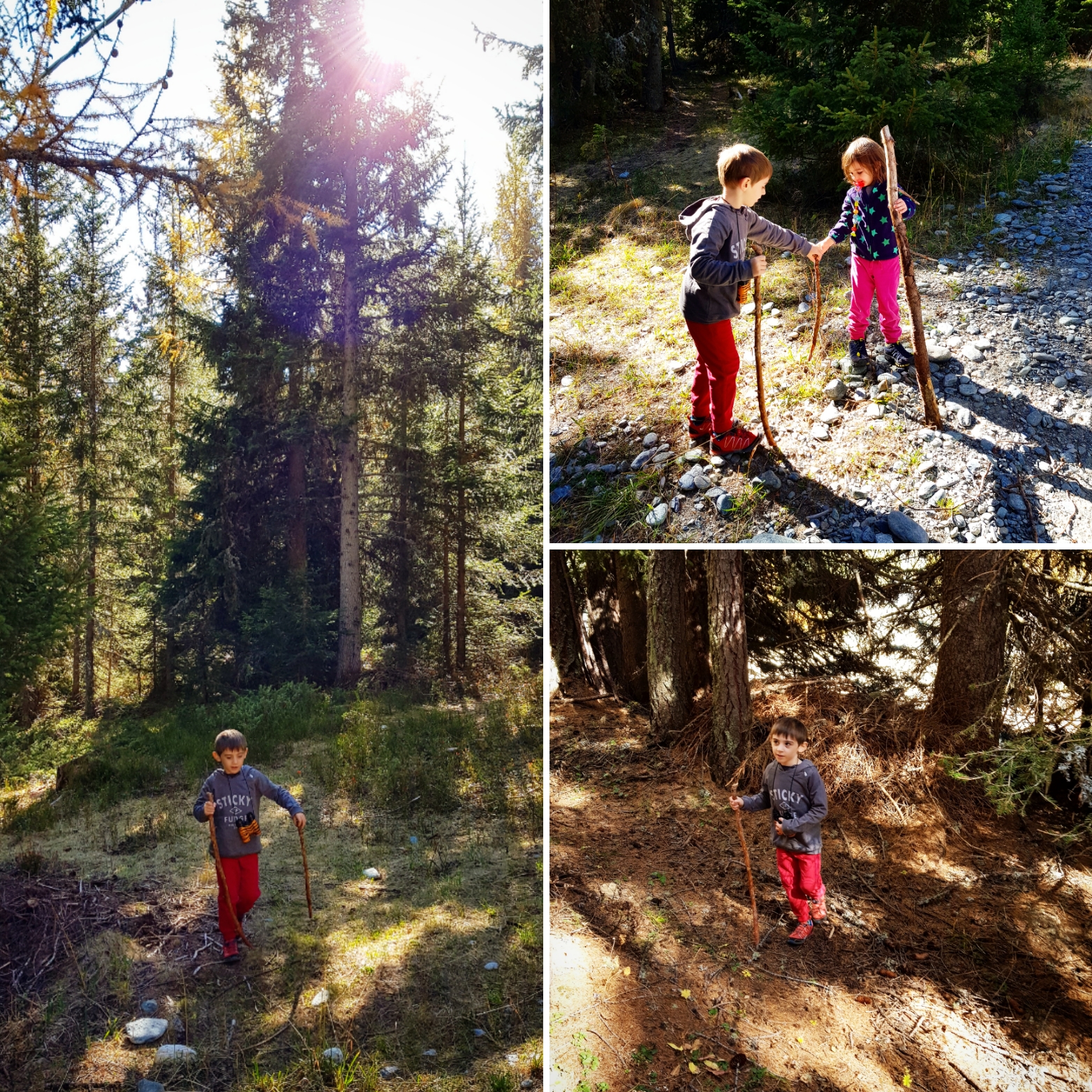 Con Tobia va a meraviglia, ha 5 anni e mezzo e apprezza molto più di quanto mi aspettassi da un bambino piuttosto cittadino. Sui monti si sente libero di camminare, esplorare, seguire i sentieri e cercare le tracce degli animali. Si inventa storie e cerca di indovinare a chi appartengono gli escrementi, del perché ci siano dei segni sui tronchi e raccoglie rami per farne dei bastoni da camminata. Non si lamenta, anzi è felice e può veramente lasciarsi andare.